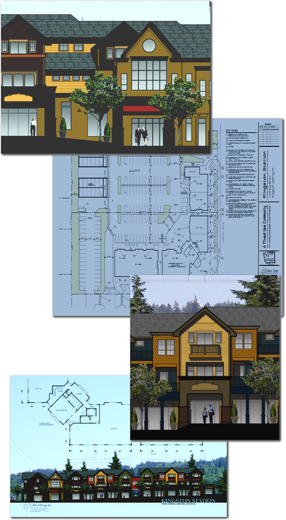 Kingston Station is a large mix-use community development located in the Kingston downtown. The site is within easy walking distance to the ferry and the downtown core. the commercial space on the ground floor is designed to house both retail shops and restaurants. The top floors will have condos or apartments with views to the Puget Sound and the City of Kingston. |